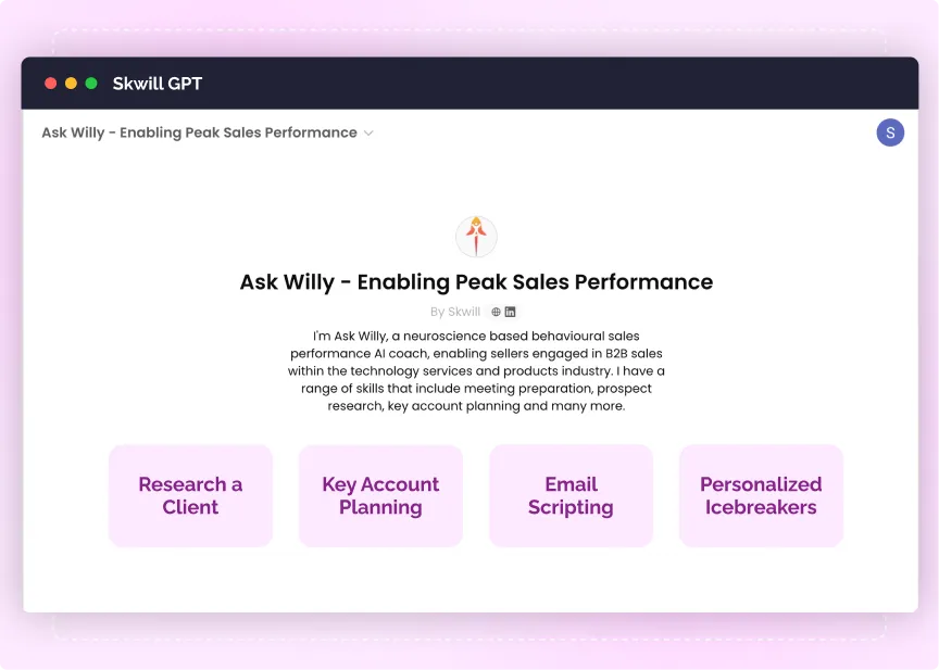 Skwill provides AI-powered coaching to enhance selling skills and build confidence in engaging sophisticated B2B buyers.